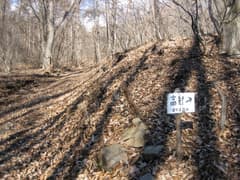 食事と展望でのんびり休んだ後、稜線を少し戻って、分岐から下山する。ロープのある岩場を降りると、あとは明るい雑木林の中の緩い下りだ。やがて、細い林道に降り着く。「高岩→安中山の会」と書かれた道標があった。林道を下ると、車を置いた場所はすぐだった。