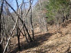 ハイキングコースに入ると、杉林の中に道が続いている。最近、人が歩いた形跡は全くないが、道型ははっきりしている。杉林を抜けると雑木林の明るい道になり、気分が良い。再び、杉林に入るとジグザグに山腹を登る。このあたりからちょっと怪しい感じになるが、まだ道型は残っている。
