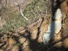 尾根に近づいて杉林を出ると、雑木林と笹原の道となり、途端に道がはっきりしなくなる。途中に、土に半分埋まりかけた馬頭観音?の石像を見なければ、ここがかつての峠道だったと確信して進めなかっただろう。