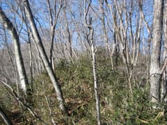 やがて、笹が低い平坦な場所に出て、右に壊れかけた造林小屋を見る。ここから尾根を逸れて、ほとんど平らな山腹を歩く。