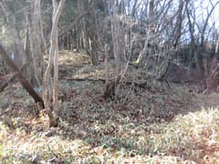 一方、群馬県側には尾根の直ぐ脇に幅5mくらいの大きな亀裂がある。地滑りが起きているのだろうか。亀裂の中には木が生えているので、数十年前からのもののようだ。そういえば、矢川峠の下の平坦地は地滑り地形のように思える。