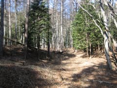 林道右側の山腹を注意して見ながら歩くが、ハイキングコースの入口は見つからない。林道はもう一度、川を渡って上流へ延びて行く。さらに歩いて行くと、砂防堰堤の工事現場(この日は休工)を過ぎ、そこから崩壊した道となって山腹を上がり、尾根に出たところで林道終点になった。ここは1032mピークから北東に延びる尾根の上で、ハイキングコースとは谷を隔てて一つ南だ。結局、ハイキングコースは道標だけを残して、痕跡もなく消えてしまったのだろうか?
