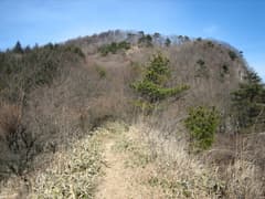 道が怪しくなったら、稜線を辿る。幸い、疎らな雑木林とあまり密ではない笹藪で、微かな踏み跡も断続しているので、そう苦労なく進める。展望は木の間から日暮山が見えるくらいだが、天気が良く、明るい尾根の登高となる。