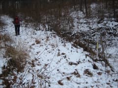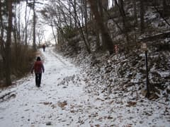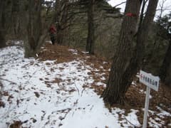数カ所ある林道分岐には道標が立っているが、一か所、全く道標のない分岐がある。このコースは地形図にも載っていないし、他の情報もない。左じゃないかという意見もあったが、ここは一発、新年初の運試し。道の様子+山勘のみで右の道を選ぶ。結果は正解でした(v^^)。