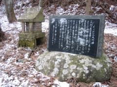 うっすらと雪が積もった林道をなおも登って行くと、杉林の中に「月波(つくば)の泉」という道標があり、ちょろちょろと水が湧き出している。その近くには石祠と「くらおかみ大明神」と刻んだ石碑があり、この泉や石祠、夫神岳の由来について、次のように記されていた。