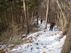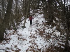 登山道に入り、山腹を左にトラバースして行く。杉林に入り、小沢を丸太橋で渡ると未舗装の林道に出る。ここからしばらく林道を辿り、ジグザグに杉林の山腹を上がって行く。