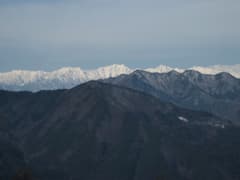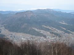 頂上南面は青木村の平野に向かって切れ落ちており、夫神岳に勝るとも劣らない展望だ(見える方角が異なるので、甲乙付けがたい)。青木村のほぼ全域が視界に収まり、上田から軽井沢にかけて広がる平野の向こうには噴煙を上げる浅間山が遠望される。昨日登った夫神岳の山容もよく見え、その向こうにはキザキザの稜線を見せる独鈷山、遠くには美ヶ原、蓼科山の白い峰も見える。
