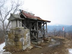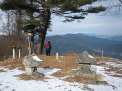 右の松林は松茸山になっているらしく、入山禁止の張り紙とビニールテープによる柵が張り巡らされている。尾根の左右は結構な急斜面だ。右から急坂の村松西洞コースを合わせると、三つの祠が祀られる子檀嶺岳頂上に到着した。