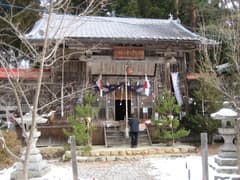 この祠は寛文五年(1665)に立て替えられたもので、祭神はくらおかみの神である。おかみ信仰は高龗(たかおかみ)と闇龗(くらおかみ)の二柱神である。共に雨の神、水の神であり、古来、たかおかみは夫神岳の山頂に、くらおかみはここの湧水の脇に祀られている。いずれも遠い昔の雨乞いの歴史を今に伝えるのである。このおかみ信仰がもとになってこの山を夫神岳と呼び、麓の村は夫神郷と呼ばれるようになった。この社に夏祭りの時奉納されるしなり織りは雨の神、龍神の姿をあらわすものとされている。