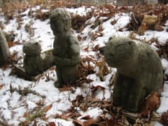 2泊をのんびり過ごした沓掛温泉を発ち、青木村中心部のコンビニで昼食を買い足した後、修那羅峠を越えて、筑北村側から安宮(やすみや)神社へ車で上がる。こんなところに、と思うくらい山奥の山上にある安宮神社の境内は、初詣の参拝客も一段落したのか、ひっそりとしていた。お参りをした後、社殿の裏手に回ると、総数860体という石仏がここそこに散在する。近郷の村民によって納められたという石仏はどれひとつ同じものがなく、個性的なものばかりだ。