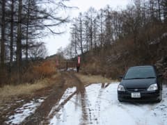 安宮神社から往路を戻り、子檀嶺岳の田沢嶺裏コースに向かう。登山口への車道はネジ工場へのアクセス道路で、正月休みで除雪されていないためか、雪に覆われていた。工場正門の手前で右の林道に入り、少し先でゲートに突き当たる。ゲートの鍵は開いていたが、ゲート前のスペースに車を停めて、ここから歩くことにする。