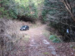 左の根本山道に入ると、深い渓谷の底を流れに沿って走る悪路となる。道はぬかるんで狭い上に路肩が弱そうで、慎重に運転する。送電線の下を通り、2つめの橋を渡った所のスペースに車を置く(Uターンは問題ない)。車の外に出ると、水音が高い。すぐそばの滝のせいもあるが、意外と水量が多い大きな谷で、ということは難所もありそう。ちょっと緊張する。