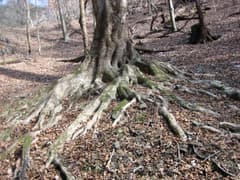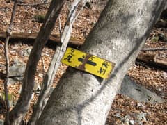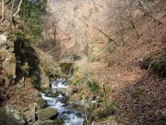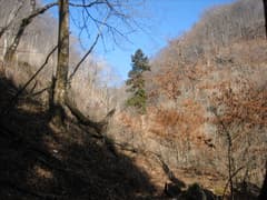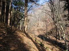 ここからは杉林の中の山道となり、何回も飛び石伝いに流れを渡る。途中、枝沢の出合で道が不明になるが、本流沿い右側にか細い踏み跡が続いている。壊れた森林保護の看板を見ると、左斜面は杉林、右斜面はところどころに杉の巨木が立つ、落葉した明るい雑木林となり、気分が良い。しかし、雑木林の斜面をトラバースする道は落ち葉が積もって、全く見えない。