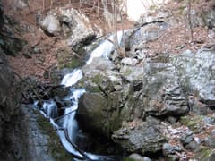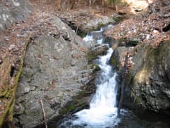 右の本流に入ると、すぐに大きな岩場に阻まれる。この奥に滝があるらしい。行きには時間が心配だったので、帰りに覗いてみると、なかなか立派な滝があった。