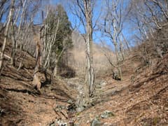 落ち葉に埋まった斜面をトラバースし、浅く開けた谷を緩く登って行く。行く手に青空と稜線が見えて来て、気分は上々。左斜面が伐採地になると、再び道型は怪しくなるが、沢沿いに進めば問題ない。