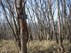 伐採地を抜けると再び雑木林となる。水量もさすがに少ない。途中で「足尾←No.5→飛駒」という、とってもビッグなコースの道標があった。いつ頃付けられたものだろう。この道標が、かつての道を示す最後のしるしで、あとは沢を詰めて行く。右手に比較的傾斜が緩そうな笹原が現れたので、この辺で本流から離れて、笹原を登る。