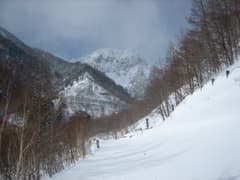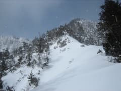 私も、さてどうしようと思ったが、周囲を見渡すと右手の斜面に赤テープを発見。もう少し登ってみることにする。夏道沿いは樹林が空いていて歩き易い。傾斜は急だが雪質が良く、スノーシューでステップを切って登る。一段、尾根を上がると緩くなり、これはスノーシュー向きと一旦は喜んだ…。