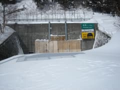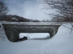 雪の詰まった浅い谷を上がり、低い砂防堰堤を越えると、金精トンネルの入口に到着した。もしかしたらトンネルを歩いて群馬県側に抜けられるかな、と思っていたが、入口はしっかり板囲いされて塞がれていた。残念(^^;)。