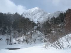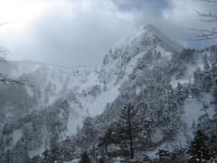 ここから金精道路を辿る。ほとんど傾斜がないから歩き易いが、雪はまだ締まっておらず、足首くらいまでもぐる。群馬県側から国境稜線を越えた雪まじりの強風が吹き付けて、冬の奥日光らしい凍える天候だ。石楠花平という看板のある地点を過ぎると、行く手に険しい岩壁を擁する金精山が現われる。この迫力ある山容を見ただけでも来た甲斐があったというものだが、さらに先に進む。