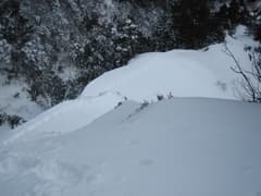 が、その先で稜線は両側が切れ落ちて急角度に登って行く。右も左も、滑り落ちたら大事(おおごと)だ。慎重にこの難所を通過する。登り切ると小テラスになっていて、一息入れる。ルートはこの先、尾根の左の急斜面をトラバースしていて、ますます嫌な感じなので、ここで撤退に決定。