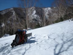 テルモスのココアとパンで昼食にし、のんびりしたのち、下山にかかる。中曽根の下りはあっけない程早い。スノーシューの下りは楽しいが、湯場見平からの下りは急過ぎるので、安全策をとってアイゼンに履き替える。無事、下に着いたときにはホッとした。