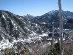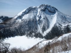 後方には、湯元の温泉街、半分凍結した湯ノ湖、その向こうに男体山、大真名子山、小真名子山、太郎山の連山が見える。黒々と樹林に覆われた台地状の南三岳の中央に、ちょこんと飛び出た岩峰があるのが面白い。