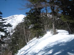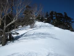 緩い雪原を登ると国境平に到着。地形図によると夏道は稜線を越えて群馬県側の山腹を絡むように登るようだが、ここは稜線通しに2303mピークを目指す。