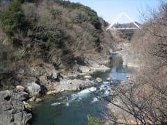 山道を高津戸橋に下り、橋の袂から高津戸峡の遊歩道を歩いて、上流のはねたき橋に向かう。巨岩の間を水が滔々と流れている。途中のポットホール(甌穴)は、磨かれて丸くなった石が中に残っており、面白い。
