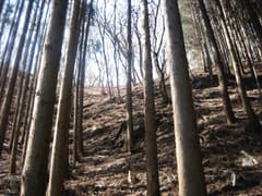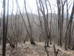 朱塗りのお堂を過ぎ、谷沿いの車道を上がる。砂防堰堤の前の分岐は橋を渡って左へ。山道となって、舗装された林道に出る。これを横断して、さらに杉林の谷間の未舗装林道を登る。漆喰壁の廃屋がある。途中の林道の分岐は左へ。最後は道が消え、下枝が積もった杉林の急斜面を登ると、大畑山のすぐ東の稜線に出る。稜線の上はまだ冬枯れの明るい雑木林で、藪はない。稜線を左に辿って程なく、大畑山の頂上に到着した。