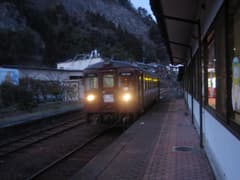 バスを待つのは私一人。定刻を5分過ぎてもバスが来ないのに焦れて、バス停をちょっと離れて駅前広場を横切り、表通りに様子を見に行く。駅前の信号が変わったとき、予想外の方向からバスが現れて、駅前広場に入って来た。慌てて手を振り回しながらバス停に戻るが、バスは止まることなく駅前広場をぐるっと一周して、走り去って行った。ガッディーム凸(-_-#)、止まってくれよぅ(T_T)。居合わせた地元のおじさんに、いやーあのバスは早いんだよ、バス停にいないとだめだよー、と慰め?られる。しかし、父不見山でもバスにオーバーランされたし、どうも過疎地のバスとは相性が悪い(と八つ当たり)。