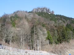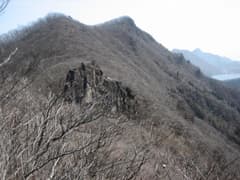西峰からササと雑木林の尾根を緩く下り、稜線上に衝立の様に突き出た耳岩を、北を巻いて通過する。巻き道から稜線に出て、倉渕・鳴石方面への分岐(道標有り)から稜線を戻る様に辿ると、すぐに「杖ノ神頭」という標識のある小ピークに出て、杖ノ神峠への急だが短い下りとなる。振り返るとその名の通り、耳のように突き出た岩を乗せた耳岩が見える。