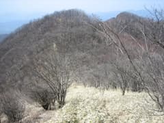 鞍部に戻り、掃部ヶ岳への尾根を登る。明るい雑木林やカラマツ林とササの道が続いて、気持ちが良い。今日は風も弱く暖かいので、急坂の登りで一汗かく。