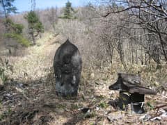 杖ノ神峠を通る車道に出る直前には、松の木陰に古い石仏と石祠があり、昔から往来のあった峠であることを偲ばせる。