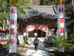 馬隠れの杉という、根本に大きな洞(うろ)のある大杉を見ると、そのすぐ上が弥勒寺だ。丁度、貸切バスが到着したところで、まだ朝早いにもかかわらず老若男女が多数参拝に来ていた。弥勒寺は巨大な天狗のお面があることで有名。拝殿の薄暗い一角を占めているお面を見ると、ギョッとする迫力がある。小さい子供が怖がっているのも、無理はありません(^^;)