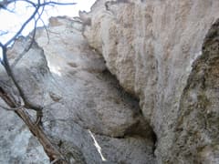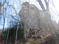 参拝を終え、拝殿の右手の中雀門の渡り廊下をくぐると迦葉山への道標があり、登山道が始まる。まだ冬枯れで明るい雑木林を登って行くと、頭上に牙のように突き出た和尚台の岩峰が現われる。和尚台の基部には古いお堂と道標があり、左は岩峰を巻いて迦葉山へ、右は「和尚台 胎内潜り 鎖場のため滑落注意」とある。胎内潜りは岩峰の裂け目の一見凄そうな鎖場で、高岩の登攀を思い出す。ちょっとビビっていると、男性が一人降りて来た。話を聞くと、胎内潜りは大したことはないが、そこから先が大変らしい。まあ、とにかく登ってみますか。