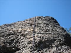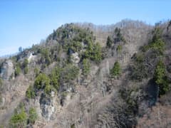 胎内潜りの中は狭いが、確かに大したことはなく、岩峰をくぐり抜けて反対側のテラスに出る。岩峰に向かって左側の岩壁に鎖がぶら下がっていて、ここから本格的な岩登りらしい。ザックをデポし、デジカメだけを携帯して鎖を摑む。最初の鎖を登って右にトラバース(ここも鎖を頼る)、スラブにかかる鎖を登る。ここまでは易しいが、次の鎖場が難所。急峻な岩稜に掛かっていて、右にも左にも振られそうに見える。「群馬山岳移動通信」の重鎮さんは、ここが雪と氷で覆われた1月に登っているのだから、すごい(@_@;)。こういう場所はあまり考えずに、気合いで登るしかない。この鎖場を一気に登り、次の鎖場もそのまま登り切ると、和尚台の頂上に出た。息が切れて、腕が疲れたー。