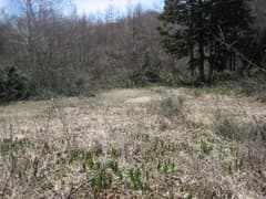 緩くて広い尾根を下る。ところどころに立派な道標があるものの、ササがかぶさる藪っぽい道だ。でも、奥山の雰囲気があるのが良い。平坦なブナ林を進むと白樺湿原に出る。チョロチョロと水が流れる小さな草原で、コバイケイソウの類の葉っぱが出始めていた。