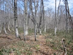 ブナとササの林の中をゆるゆると登り、緩いアップダウンのある尾根を辿る。ところどころにアスナロの大木があり、赤黒い幹がきれいだ。展望はほとんどなく、いくつかの地点で行く手の尼ヶ禿山や武尊山が見えるだけだ。玉原湖からの道を合わせると尾根が少し細くなって、残雪も現われる。