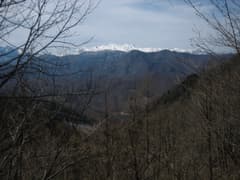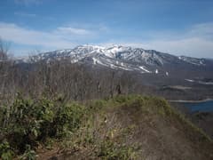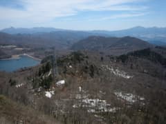 頂上の北側は樹林に囲まれているが、木の間から奥利根の残雪の山々が眺められる。南側は開けて、今日歩いて来た迦葉山からの縦走路が一望だ。東側には斑に雪が残る武尊山がゆったりと稜線を広げている。中腹の白い筋は私も何回か滑ったことのあるスキー場で、GWいっぱい営業している。駐車場の1/3くらいが車で埋まっているのが見えるので、まだまだお客さんで賑わっているようだ。