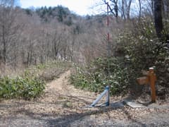 車道を暫く辿り、左へ分岐する林道に入る。道標があり「玉原越え起点へ」と書かれている。この林道を少し進んだところが地形図で玉原越と記された地点で、今は林道の盛り土で埋め立てられていて、峠の風情はない。「水上長沢橋へ」という道標に従って、藤原湖方面への山道を下る。