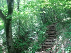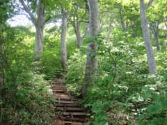 捲道と合流し、「山頂まで1250m、半分を過ぎました」という道標を見る。小さなアップダウンのあと、鬱蒼と茂るブナ原生林の中の急登となる。瑞々しい緑の中に林立するブナの青灰色の幹が奇麗だ。