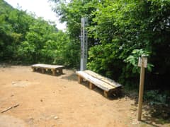 やがて小さな尾根の上の登りとなり、展望のない道をしばらく辿ると、ベンチが置かれた小平地に出る。道標によると「二ノ字」と呼ぶ場所らしい。ここは米山の方向の眺めが少し開けて、木の間から山頂が見える。ベンチに腰を下ろして休憩。水とビスケットを補給する。