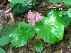 赤くガンバレと彫り込まれた岩を過ぎ、道の脇に石仏を見ると、傾斜が緩んでブナ林も終わり。代わりに、下の方では葉だけだったイワカガミが咲き残っているのを見る。