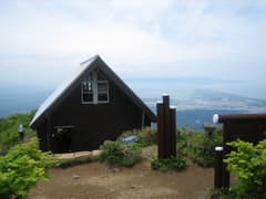 米山林道終点から登って来る最短ルートを左から合わせる。その先で水場の道標を見るが、帰りに立ち寄ることにする。だいぶ背の低くなった林の中を登ると、頭上に青空が広がり、その中に避難小屋の大きな屋根を見る。米山頂上に到着だ。