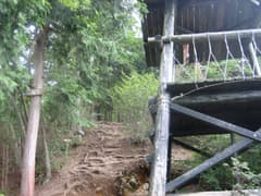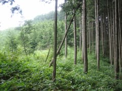 尾根を登ると、丸太を組んだ展望“砦”がある。攀じ登ってみると南側の展望が開けているのだが、今日は湿度が高く、景色は霞んでいる。杉林の尾根をなおも登ると、左から荒廃した林道が上がって来て、「後沢にんじゃコース