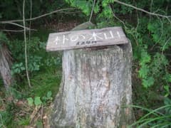 朴の木山の頂上は、切り株の上に山名標が置かれているだけで、そっけない。南側は植林帯で、かつては眺めが良かったらしく、丸太がベンチ替わりに置かれていたりするが、杉が育ってしまって、眺めを得ることは難しい。少し伐採すれば良い展望台になると思うのだが、これでは登って来た子供ががっかりするかもよ。
