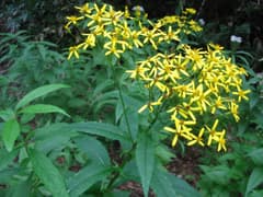 四郎峠へは、環湖荘に向って左側の駐車場の奥から左の沢を渡渉し、右岸の砂利道を上がる。木の幹に打ち付けられた「四郎峠←→丸沼」というブリキ板の標識を見て、少し先で赤テープに導かれて沢を左岸に渡る。道は山道になり、何回も沢を渡り返す。河原には黄色やピンクの草花が群生している。後で図鑑で調べたら、黄色の花はキオン、一見、花びらが散った後のように見えるピンクの花は、じつはこれが咲いている状態で、ヒヨドリバナというらしい。