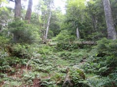 この小尾根は、左右を平行して沢に挟まれ、どちら側もすぐ下は沢床になっている。尾根の上はオオシラビソやアスナロなどの針葉樹で覆われている。尾根の幅は狭い所で数mで、渡り廊下のようになった面白い地形だ。