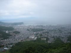翌日、札幌から倶知安に鉄路で移動する。途中、小樽で下車して観光。ロープウェイで天狗山に上がってみる。夜景の名所に昼間、しかも台風の影響で小雨がしょぼつく中で出かけるとは、我ながら酔狂だなぁと思うが、山頂駅に着いてみれば、小樽市街と港を眼下に見下ろす展望はなかなかで、来て良かったかも、と思う。酔狂ついでに傘をさして、山頂駅から徒歩8分ほどの天狗岳の三角点にも登ってみる。こちらの方は樹林と笹に囲まれて展望は全くなく、北海道の山らしい原始の香り?ただよう頂上だ。