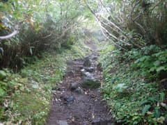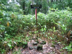 登山道は、最初は深い森林の中を緩く登り、やがて右手の尾根に向かってジグザグに急登する。途中に風穴という標識があり、岩の間から涼しい風が吹き上がっていた。尾根の上に出ると二合目で、丸太のベンチがある。管理人さんともう一人の登山者が休憩を終えて歩き始めたところだった。雨が止んだので、ここで雨具を脱ぐ。二合目からは尾根の上を登る。途中、管理人さんが台風で登山道に落ちた大きな枝をどけようとしていたので、ちょっと手伝い、先に行かせて頂く。